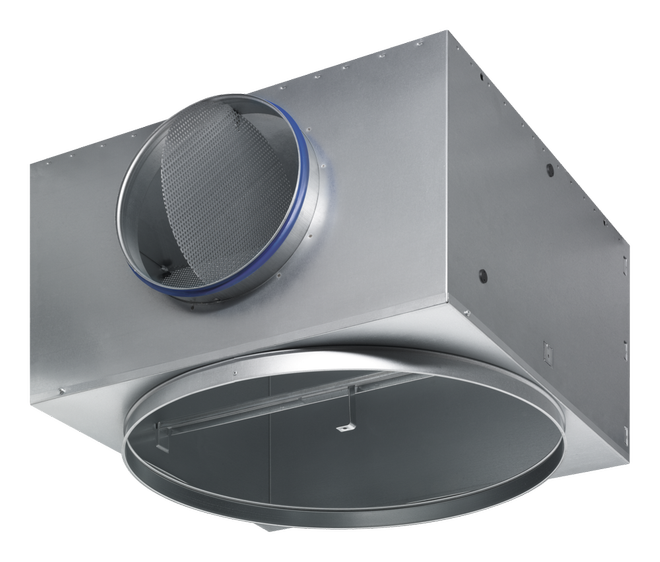 Plenum boxes are used to connect ceiling diffusers to circular ducts and to fix the diffuser face. Type AK-Uni plenum boxes are fitted with an equalising element that ensures that the air is evenly distributed to the room. A damper blade (optional) simplifies volume flow rate balancing for commissioning. Pressure tap and cord-operated damper blade (optional) allow for volume flow rate balancing with the diffuser face in place.