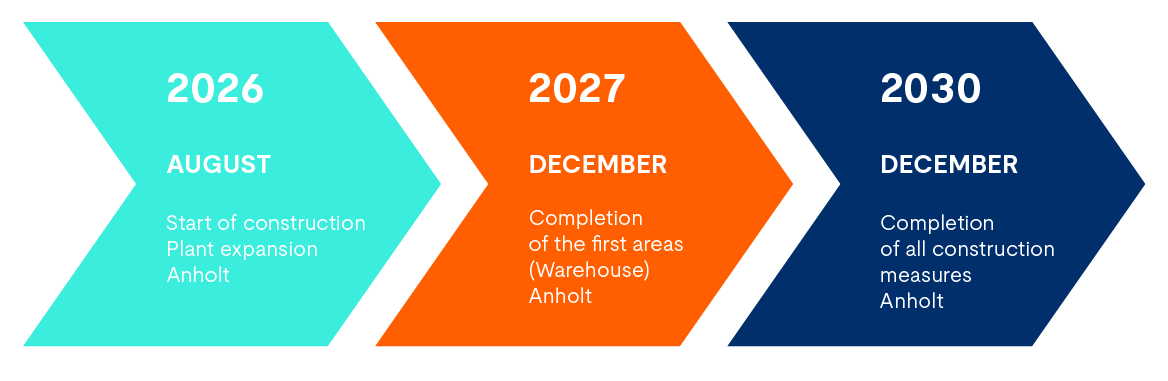 The plant expansion in Anholt comprises 20,000 m² of new hall space for production, storage, administration and training. In a first step, 10,000 m² of production-related storage space will be created by the end of 2027. The remaining construction phases will follow successively, with completion planned for the end of 2030.