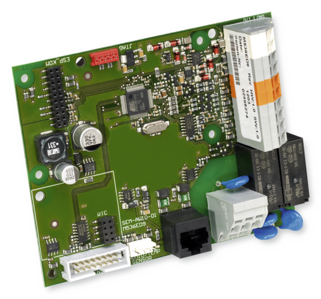 Die Grundplatine, die für jedes dezentrale Lüftungsgerät erforderlich ist, übernimmt die Regelung bzw. Steuerung sämtlicher Funktionen, die für den Betrieb erforderlich sind, z. B. Ansteuerung der Ventilatoren und Stellantriebe.