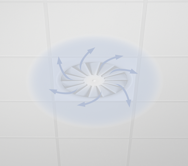 • Effizienter Drall mit hoher Induktion bewirkt schnellen Abbau der Temperaturdifferenz und der Luftgeschwindigkeit