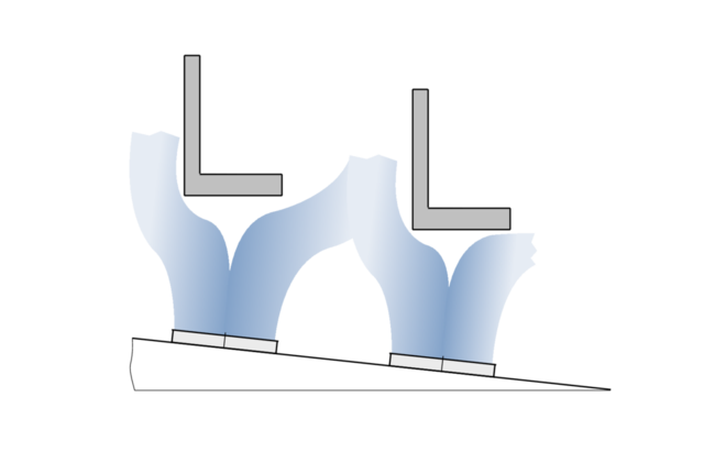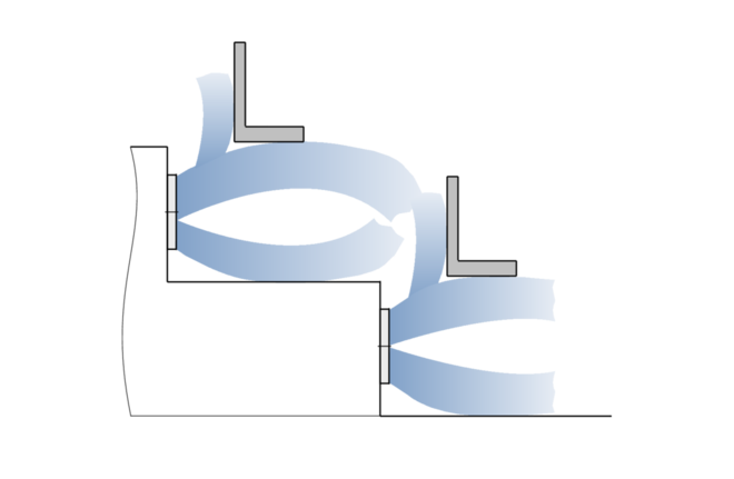 Type SD staircase swirl diffusers have fixed blades. Different attachments are available to influence the air pattern and adapt it to local requirements. A spigot can be used to achieve air discharge parallel to the installation surface, while a cross bar can be used to achieve angled air discharge. The air pattern should be such that the air does not blow onto the feet of people sitting near the diffuser. If staircase swirl diffusers are placed underneath seats or vertically in the steps between seats, angled air discharge is recommended. If diffusers are placed in the steps below the seats, parallel air discharge is recommended. The supply air to room air temperature difference may range from –6 to +6 K.