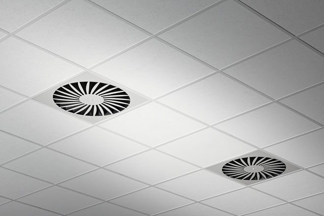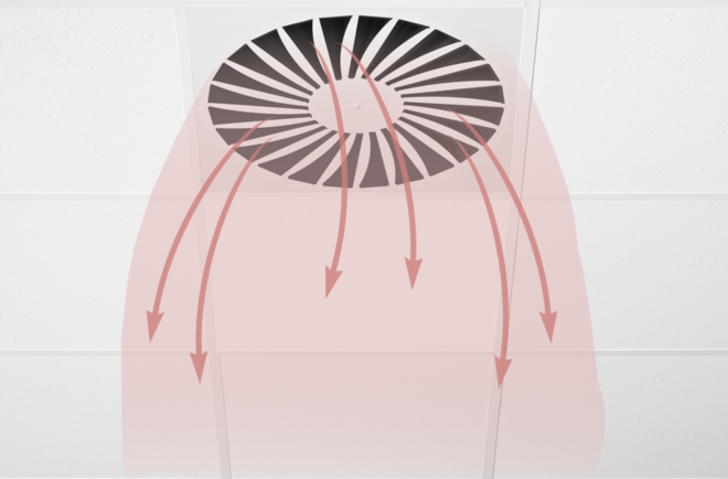 Ceiling swirl diffusers in air conditioning systems create a swirl to supply air to rooms. The resulting airflow induces high levels of room air, thereby rapidly reducing the airflow velocity and the temperature difference between supply air and room air. Ceiling swirl diffusers allow for large volume flow rates. The result is a mixed flow ventilation in comfort zones, with good overall room ventilation, creating only very little turbulence in the occupied zone.