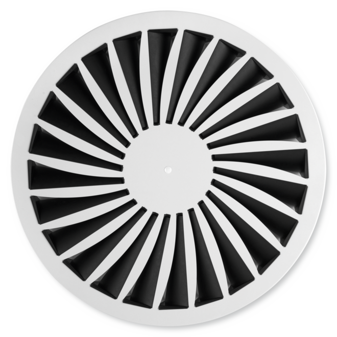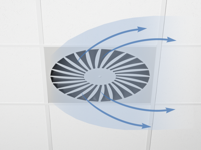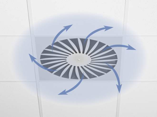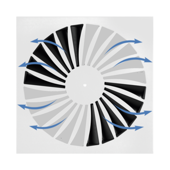 Ceiling swirl diffusers with square or circular diffuser face. Supply air and extract air variants for comfort zones. Diffuser face with individually manually adjustable air control blades for horizontal swirling supply air discharge creating high induction levels. For installation into all types of suspended ceilings.