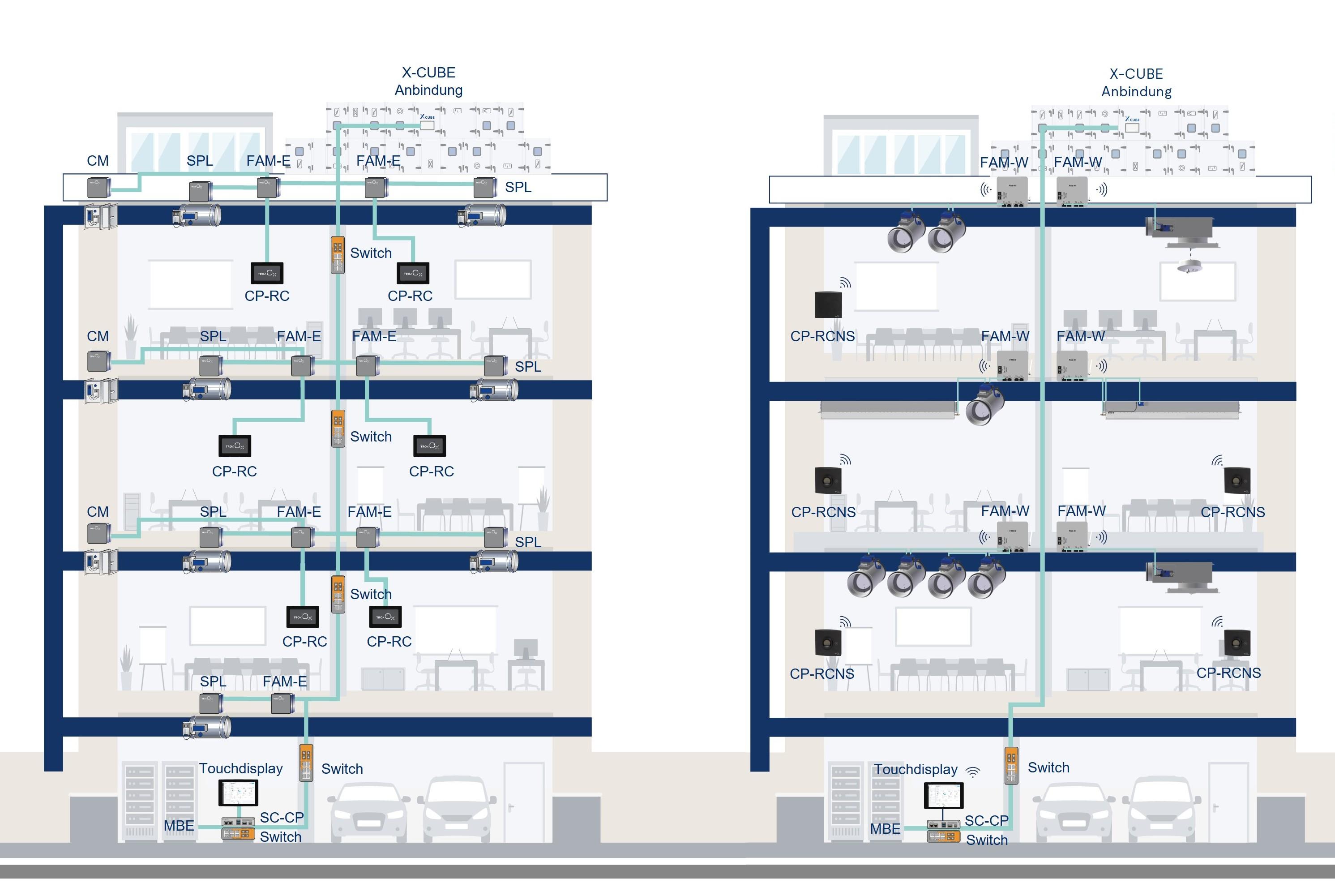 Ob Neubau oder Modernisierung: Mit kabelgebundener oder drahtloser Kommunikation passt sich TROX OX optimal an jede Gebäudesituation an.