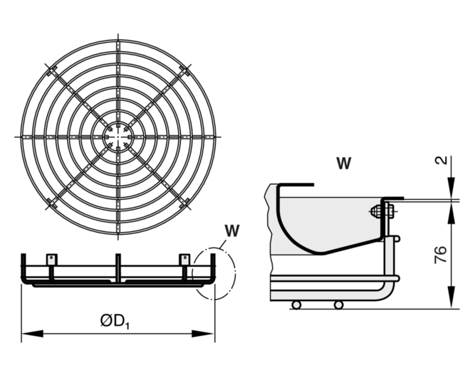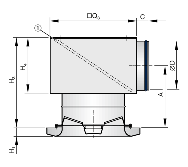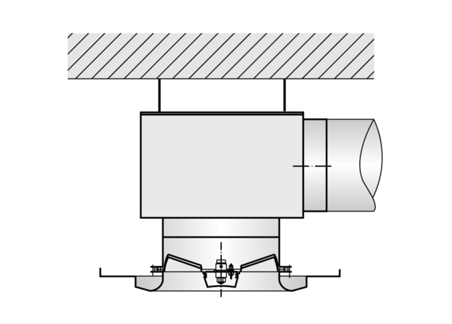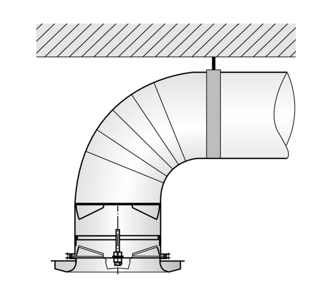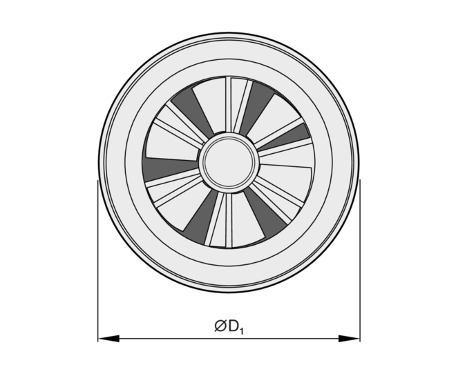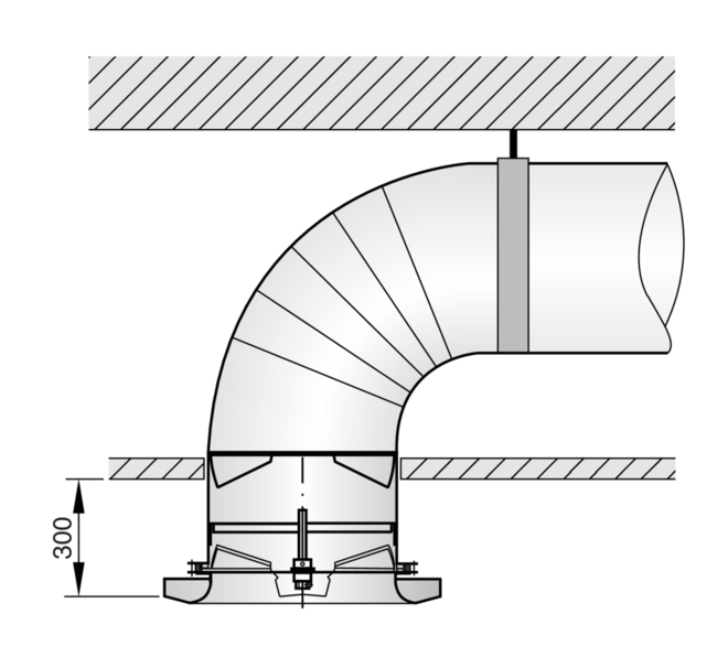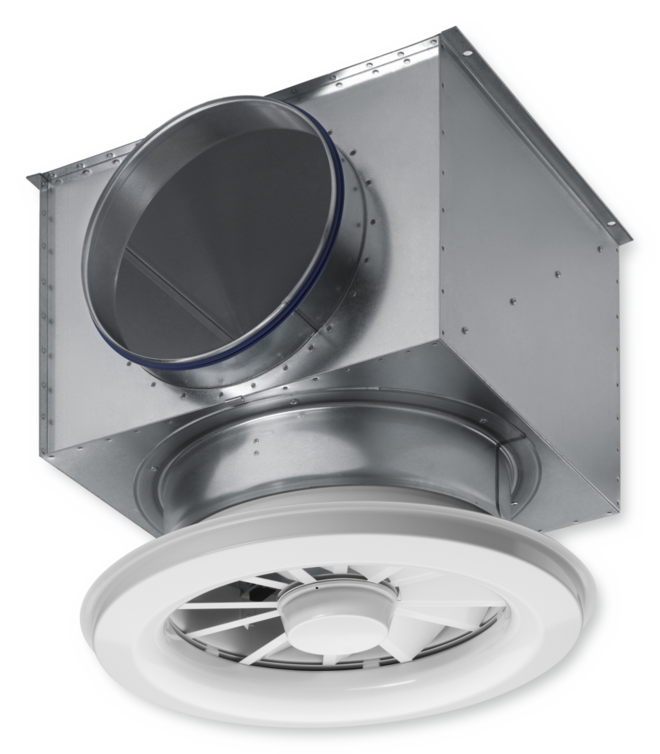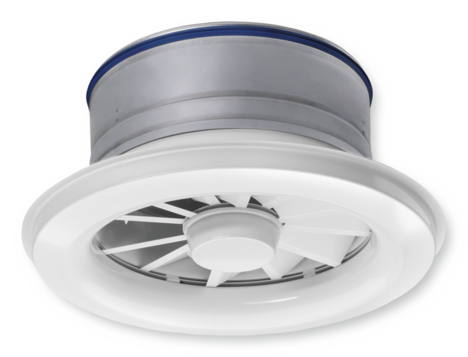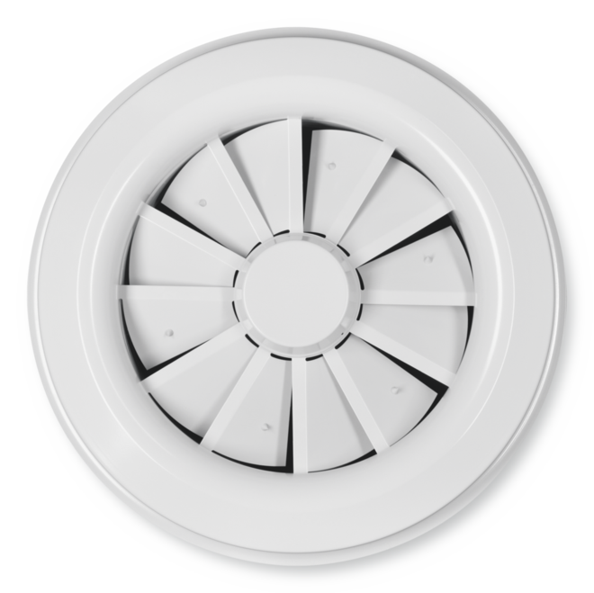 Ceiling swirl diffuser with circular diffuser face for high rooms in comfort and industrial zones. For supply air only. With fixed air control blades for horizontal supply air discharge and with adjustable blades for air discharge from horizontal (0°) to vertical (90°). Horizontal air discharge with high induction. For freely suspended installation and for suspended ceilings.