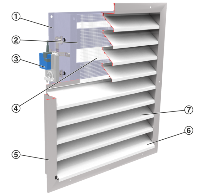 Kombinationen aus einem Wetterschutzgitter mit einer Jalousieklappe. Wetterschutzgitter in rechteckiger Bauform zum Schutz vor direkt eindringendem Regen sowie Laub und Vögeln durch Außenluftund Fortluftöffnungen. Jalousieklappe in rechteckiger Bauform zur Volumenstrom- und Druckregelung sowie zum Absperren von Luftleitungen und Öffnungen in Wänden und Decken. Einbaufertige Komponente, bestehend aus Frontrahmen, regenabweisend und strömungsgünstig geformten Lamellen und rückseitigem Welldrahtgitter. Absperrklappe, bestehend aus dem Gehäuse, strömungsgerechten Lamellen und der Klappenmechanik. Einsetzbar für Kanaldrücke größenabhängig 1000 Pa – 2500 Pa. Geeignet zum Anbau von Luftleitungsprofilen. Position der Lamellen von außen durch Kerbung in den Achsen erkennbar. Gehäuse-Leckluftstrom nach DIN EN 1751, Klasse C.