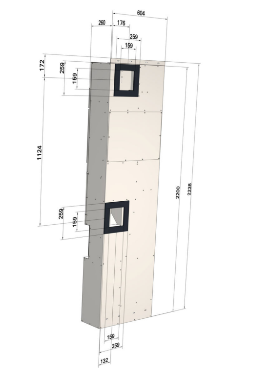 | Abmessungen [mm] | Breite 604, Höhe 2200, Tiefe 260 |