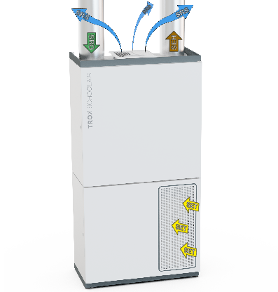 Dezentrales Lüftungsgerät TROX X-CUBE/SCHOOLAIR-SHV-0-EH mit Zu- und Abluftfunktion, Rotationswärmerückgewinner sowie elektrischer Nachheizfunktion zur freistehenden Aufstellung im Raum:
